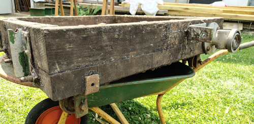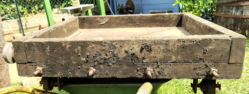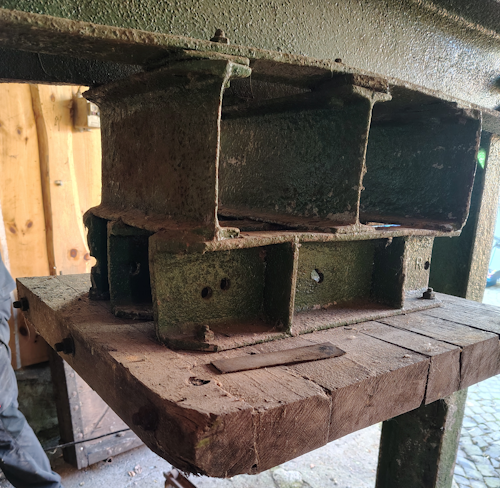 Zum Holz: Da ist vor allem der Wagen auf dem der Maische-Stapel aufgetürmt wird. Der sah etwas mitgenommen aus – sowohl vom Holz her, als auch die angebrachten Metallteile. Bzgl. Holz haben wir uns mit fachkundigen Menschen (Grüße an Tini 👋) beraten und beschlossen: bissi abschleifen – fertig. Schließlich wollen wir keine Rückstände von Ölen oder Lacken im Saft. Holz mache alles mit, man müsse ihm nur Zeit geben (die Analogie zu „wie bei alten Männern“ lässt mich immer noch schmunzeln 😉). Auch der sog. „Gegenstempel“, also wo der Wagen gegengedrückt wird, brauchte etwas Liebe. Also alles Metall ab (außer den Verbindungsstreben), teilweise neu lackiert, Holz abgeschliffen, alles wieder montiert, fertig.