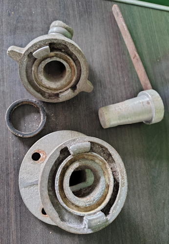 Ein kleines aber wichtiges Detail: im ersten Bild sieht man den Auslauf am Wagen. Da sind Dichtungen drin, die ihrem Namen nicht mehr gerecht wurden. Im Baumarkt findet man sowas nicht. Helmut (schon bekannt durch vorige Hilfestellungen) hatte wieder die richtige Idee: der Anschluss sieht aus wie bei einem Feuerwehrschlauch … vielleicht haben die ja sowas. Und siehe: Der erste Teil des Feuerwehr-Mottos „Retten-Bergen-Löschen-Schützen“ hat auch hier geholfen. Die Dichtungen passen – Auslauf gerettet!
