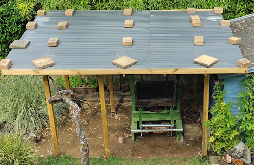 Was man im vorigen Bild anhand des Schattenwurfs erahnen kann: wir haben zwischendrin einen Unterstand (aka „Carport“) gebaut (aber die Dachplatten immer noch nicht fest verschraubt; Steine halten auch 😎).