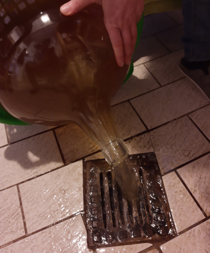 Auch wenn ich/ wir grundsätzlich der Meinung sind, dass der Heckstedter-Krönchen-Schoppe der beste auf der ganzen Welt ist, gibt es doch hin und wieder Rückschläge. Der 2020er-Jahrgang hatte wenig Säure, und somit stand es um die Lagerfähigkeit ohnehin nicht zum besten. Wenn man dann noch ‚unvorsichtig‘ ist, kippen schnell mal 25L (und mehr) ins Ungenießbare. Dann bleibt – auch wenn’s weh tut – nur der Gang zum Gulli. Gestern haben wir uns von den letzten Resten getrennt … Autsch!