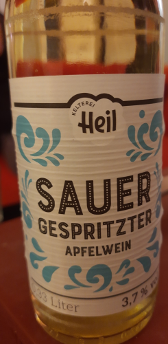 Egal: Heil’s sauer gespritzter Apfelwein ist alles andere als sauer. Er ist halt verdünnt, dadurch nur 3,7% Alkohol. Ansonsten schmeckt er sehr fruchtig, und eben eher süß.