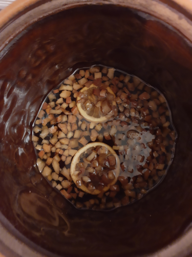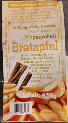 Magenrebell Bratapfel, „Feinen Likör selber herstellen!“. Diese Mischung aus hauptsächlich Zucker bekam ich letztens geschenkt (war damit eine sich mir noch nicht erschließende Botschaft verbunden?) und habe den Ansatz mit 2 L Wodka auch gleich … <Wort suchend … ach, egal> … angesetzt. Jetzt, 5 Wochen später, der Selbstversuch: äh, ja – wer probieren möchte, melde sich gerne an 🤪
