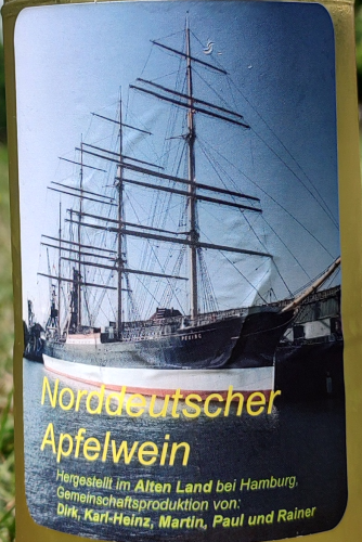 Ein bisschen enttäuschend war unsere Suche nach Apfelwein – zunächst. In den diversen Hofläden gab es jedenfalls keinen. Und auf Nachfrage haben wir nur Kopfschütteln geerntet. Man mache das hier nicht. Yo, da gäbe es die Elbler, aber das sei eine Ausnahme. Den kannten wir aber schon. Und fast wäre es dabei geblieben, hätte Elisabeth nicht an unserem letzten Abend die Ohren gespitzt und am Nachbartisch das Wort „Apfelwein“ gehört. So ein Zufall: unser Campingplatz dient auch als Treffpunkt für Einheimische, und wir saßen inmitten einer lokalen Keltergemeinschaft, wahrscheinlich der einzigen, die hier Apfelwein herstellt. Schnell war man im Gespräch und bald standen die Vergleichsmuster auf dem Tisch: einerseits Heckstedter Krönchen (Mix+Quitte und Mix+Speierling), andererseits „Norddeutscher Apfelwein“. Als Basis diente „den Norddeutschen“ roter Boskoop, mit Hefe angesetzt. Herausgekommen ist ein sehr herber, hochprozentiger (10-11%) Hausschoppen; die 2 Liter-Probe war schnell leer 😋. Das war ein sehr gelungener Abschluss unseres Urlaubs! Vielen Dank an die Truppe, dass wir ihren Schoppe probieren und 1 Liter als Souvenir mitnehmen durften!
