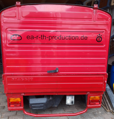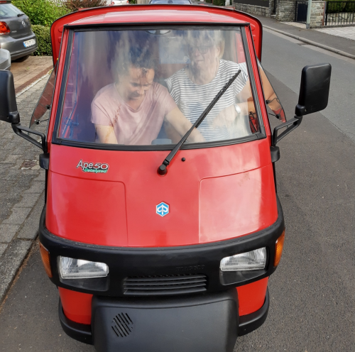 „Flotte Biene“ ist übrigens gar nicht so verkehrt. Offiziell handelt es sich um eine Piaggio APE 50, und obwohl man sich beim Fahren (insbesondere bei Steigungen) gerne mal zum Affen macht, wird das Fabrikat nicht englisch, sondern italienisch ausgesprochen: ahpe (italienisch: Biene). Die 50 im Namen steht für die originalen 49,8 ccm Hubraum, welche für 3 PS sorgen. Die Beschleunigung von 0 auf 100 km/h beträgt 6 Sekunden – wenn die APE auf einem Anhänger steht, der von einem Porsche gezogen wird 😉