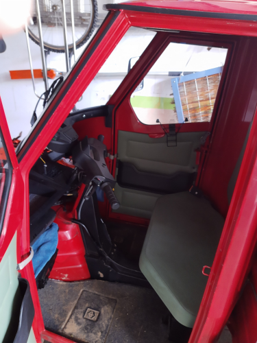 Die APE ist mit einer manuellen, 4-stufigen Klimaanlage ausgestattet: rechtes Fenster in 2 Stufen auf, linkes Fenster in 2 Stufen auf. Auch sonst ist der Komfort übersichtlich: Es gibt einen Sitz, einen Lenker mit Gangschaltung und Gashebel, Licht, Blinker, Hupe und Scheibenwischer. Das Scheiben-Wischwasser pumpt man von Hand. Es gibt auch einen Sicherheitsgurt! Der Vorbesitzer hat ein Radio und Boxen eingebaut, welches beim Fahren deutlich vom Motor überdröhnt wird.