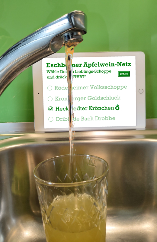 In Eschborn kann man dann überall das flüssige Gold direkt aus der häuslichen Quelle zapfen. Vorbei die Zeiten in denen man lange auf die nächste Lieferung der bevorzugten Apfelweinkelterei warten musste. Heute reicht ein Klick auf die gewünschte Sorte, und schon füllt sich der Bembel!
