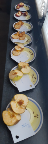 Im Laufe eines Tages haben wir von 33 Äpfeln die Eigenschaften bestimmt, gelernt dass Kernhauswände sichel-, bogen-, rucksack-, ohren- oder bohnenförmig, Kerne orange-, reh-, schwarz- oder (hell-)kastanienbraun sein können, dass Größe kein relevantes Bestimmungskriterium ist, und vieles mehr. Danach habe ich erst einmal ein Bier getrunken (Hauptsache nix mit Äpfeln🤣).