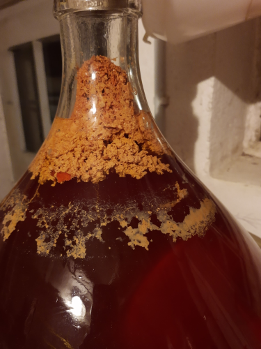 Hm … das kann man ja so nicht stehen lassen: Wir haben also noch eine andere Charge getestet, diesmal mit Speierling; da wird ja wohl auch der Geschmack kraftvoller sein – oder? Vom Aussehen her ist der Ballon erst einmal abschreckend, da sich der „Speierling-Schmock“ oben am Hals gesammelt hat. Aber man erkennt schon auf dem ersten Bild, dass die Farbe eine ganz andere ist: