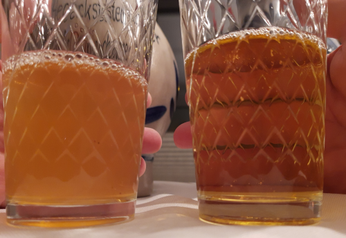 Spaß beiseite: Wie isset? Wie erwartet schmeckt die Speierlingsvariante deutlich kräftiger, gleichwohl ebenfalls noch sehr jung (aber nicht „wässrig“). Der Speierling „steht gut im Glas“, da kann man sagen was man will: ‚klar‘ sieht besser aus als ‚trüb‘.