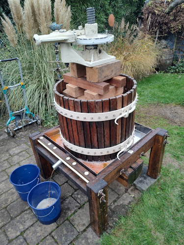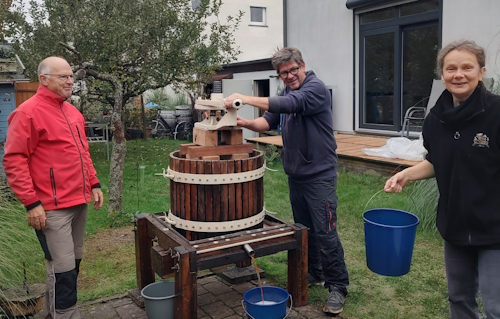 Die zentrale Frage: was ausschenken? Nur Apfelwein? Wer will das schon um 11 Uhr vormittags trinken? (yo, ich kenne so 1-3 Hartgesottene 😉). Gerhard & Sieglinde kamen auf die Idee Süßen anzubieten. Muss man halt kurz vorher noch pressen … vielen Dank an die beiden für die Hilfe!