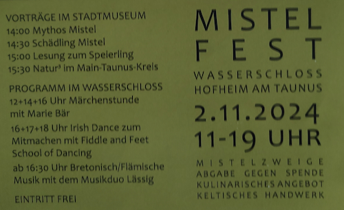 Das Mistelfest sollte eine Mischung werden aus Vorträgen, Markt und ‚Speis & Trank‘ rund um das Thema Mistel und Streuobstwiese. Am Ende waren – neben den Fachvorträgen zum Thema – Irish Dance, bretonisch/flämische Musik, keltisches Brauchtum, Mistelstrauchverkauf, ein bisschen Kunsthandwerk, Schafe, der BUND sowie „Speis & Trank“ im und am Wasserschloss in Hofheim/ Ts. versammelt – und wir mittendrin 😎.