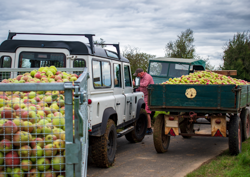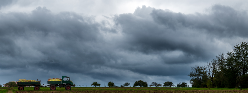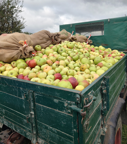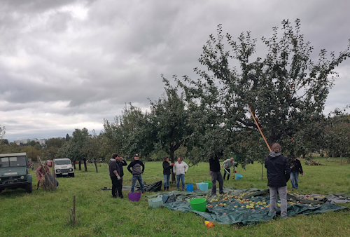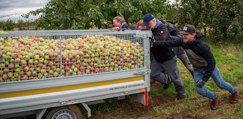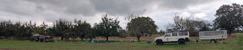 Die Wetteraussichten waren okay – bewölkt aber trocken, nicht zu kalt (Yes!) – und so traf man sich vormittags auf der Wiese, um die Ernte einzuholen. Los ging es auf der sortenreichen „westlichen Koppel“. Hier trägt fast jeder Baum eine andere Sorte; es landeten Rheinischer Winterrambour, Gloster, Brettacher, Grünapfel, Transparent von Croncels und andere illustre Sorten auf dem Unimog (Spitze!).
