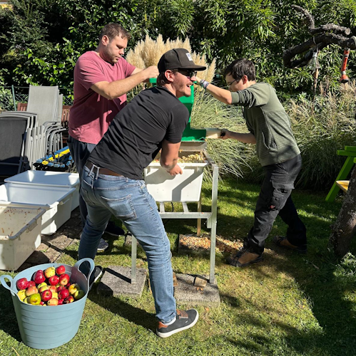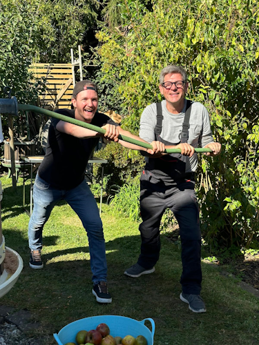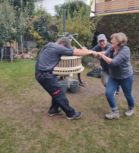 Am folgenden Samstag dann das Keltern – und das Wetter spielte wieder mit (Soooo geil!). Schnell stellte sich die gewohnte Routine ein und der Prozess von Waschen, Schnibbeln, Maischen und Pressen war am Laufen. Die Äpfel waren sehr saftig, so dass wir auch mit der alten Presse eine gute Ausbeute einfahren konnten (Unglaublich!).