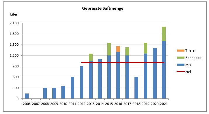 Dieses Jahr „haben wir beschlossen“ (ja, das ist wohl die korrekte Formulierung) am Apfelfest 1.600 Liter, und beim „Nachpressen“ des Bohnapfels noch einmal 400 Liter Saft erzeugt zu haben. Macht in Summe also 2.000 Liter! (klingt auch viel besser als eintausendneunhundertfünfzig 😂) Auf jeden Fall war es ein Rekordjahr – und das auch ohne die Bohnapfel-Aktion (der bisherige Rekord lag bei 1.550 Litern).
