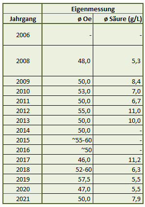 Die Öchslewerte liegen bei ca. 50°. Wir haben alle Fässer durchgemessen und haben Werte von 47°-51° gemessen, und dann beschlossen, dass der Median bei 50 liegt 😉