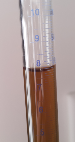 Das ist ein „Okay-Wert“; wir brauchen mindestens 44°, denn die Daumenregel sagt „Öchsle geteilt durch 8 ergibt den Alkoholgehalt“. Weil Apfelwein mindestens 5,5% Alkoholgehalt haben soll, brauchen wir also mindestens 44 Öchsle.