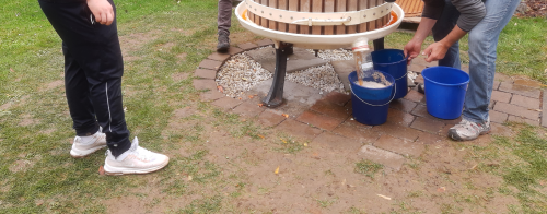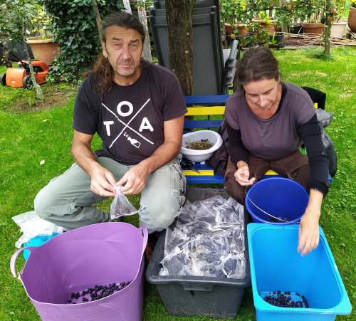 Teilnehmer des Apfelfestes haben die Trauben-Verarbeitung von Tini&Pari gesehen. Die dabei gewonnene Traubenmaische wurde vergoren, dann abgepresst, und lagert nun neben dem Schoppe zur weiteren Reifung. Es ist der dritte Versuch wohlschmeckenden Rotwein zu erzeugen – die ersten beiden Versuche, die man auf dem Apfelfest probieren konnte, sind – sagen wir mal – noch zu optimieren 🍷👍.