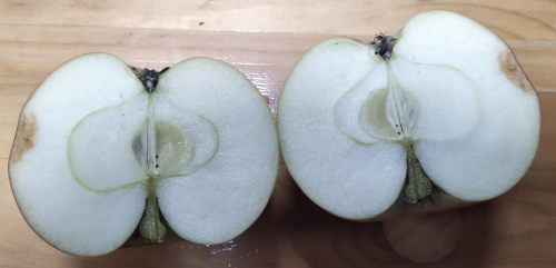Aber auch auf die inneren Werte kommt es an. Der gesuchte Apfel zeigt sich hier angeblich für Laien gut zu bestimmen (sagt zumindest Elisabeth … 🤔 … 🤷♂️), weil „Kernhaus“, die „Gefäßbündellinie“ und der „Stielansatz“ so schön erkennbar sind.